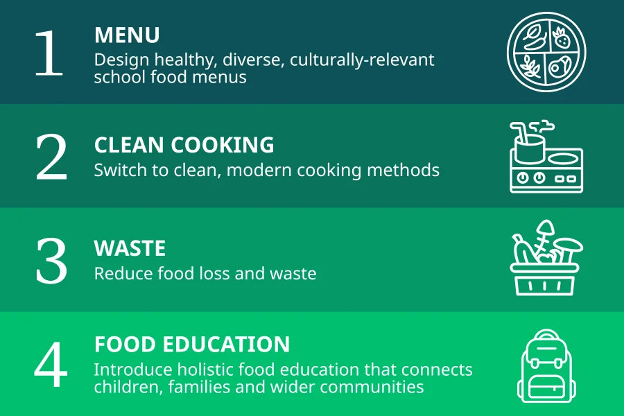 - Einführung einer ganzheitlichen Ernährungsbildung, die Kinder, ihre Familien und größere Gemeinschaften miteinander verbindet.