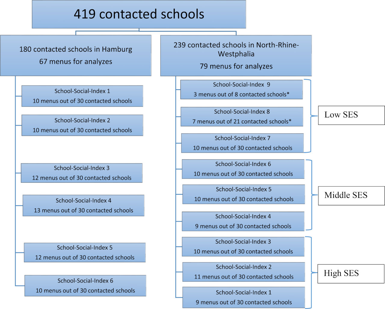 Forschende der Rheinland-Pfälzischen Technischen Universität Kaiserslautern-Landau wollten wissen, ob gesunde und nachhaltige Schulmahlzeiten für alle Kinder unabhängig vom Sozialindex der Schule zugänglich sind. In ihrer Untersuchung haben sie die Qualität der Schulmahlzeiten auch danach bewertet, ob Qualitätsstandards freiwillig oder verpflichtend umzusetzen waren. Dementsprechend wählten sie zwei Bundesländer (Hamburg und Nordrhein-Westfalen) aus. Um die Sozial-Indizes beider Länder vergleichbar zu machen, kategorisierten sie diese nach sozio-ökonomischem Status (SES) in niedrig, mittel und hoch (siehe Abbildung).