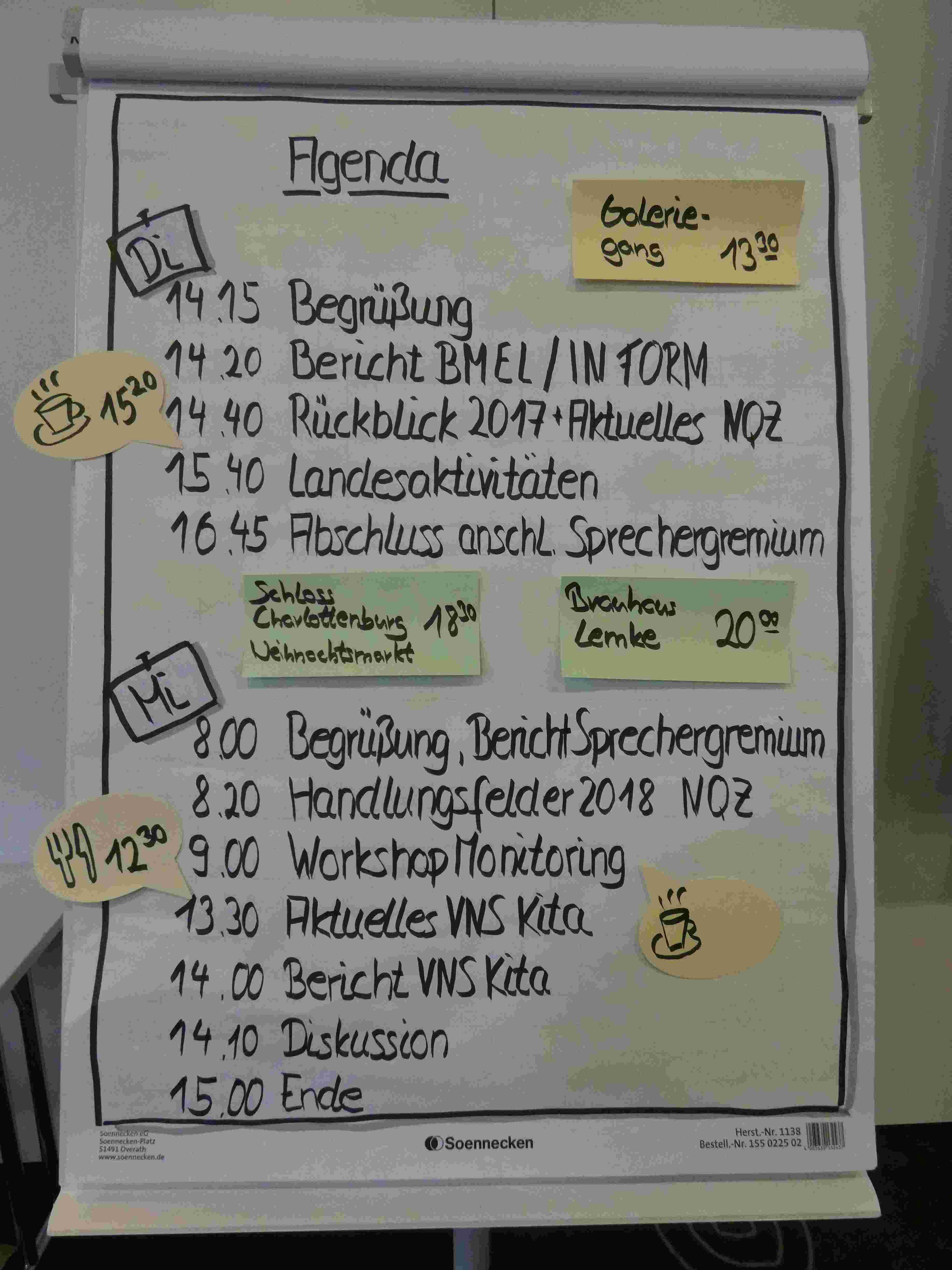 Nachdem im Frühjahr 2017 alle 16 Bundesländer einmal die Gastgeberrolle für ein Vernetzungstreffen übernommen hatten, lud das NQZ erstmalig unter eigener Regie zum17. Vernetzungstreffen nach Berlin ein. Als Einstimmung in die gemeinsamen zwei Tage präsentierten alle Vernetzungsstellen (VNS) Kita- und Schulverpflegung ausgewählte Aktivitäten aus 2017 in Form eines Galeriegangs. Auch bei diesem Treffen standen Transparenz und Austausch über aktuelle Maßnahmen und Entwicklungen in den Ländern im Zentrum. Weiterhin nahmen Vertreter des BMEL, der DGE und des Referates INFORM als Projektträger an dem Vernetzungstreffen teil.
